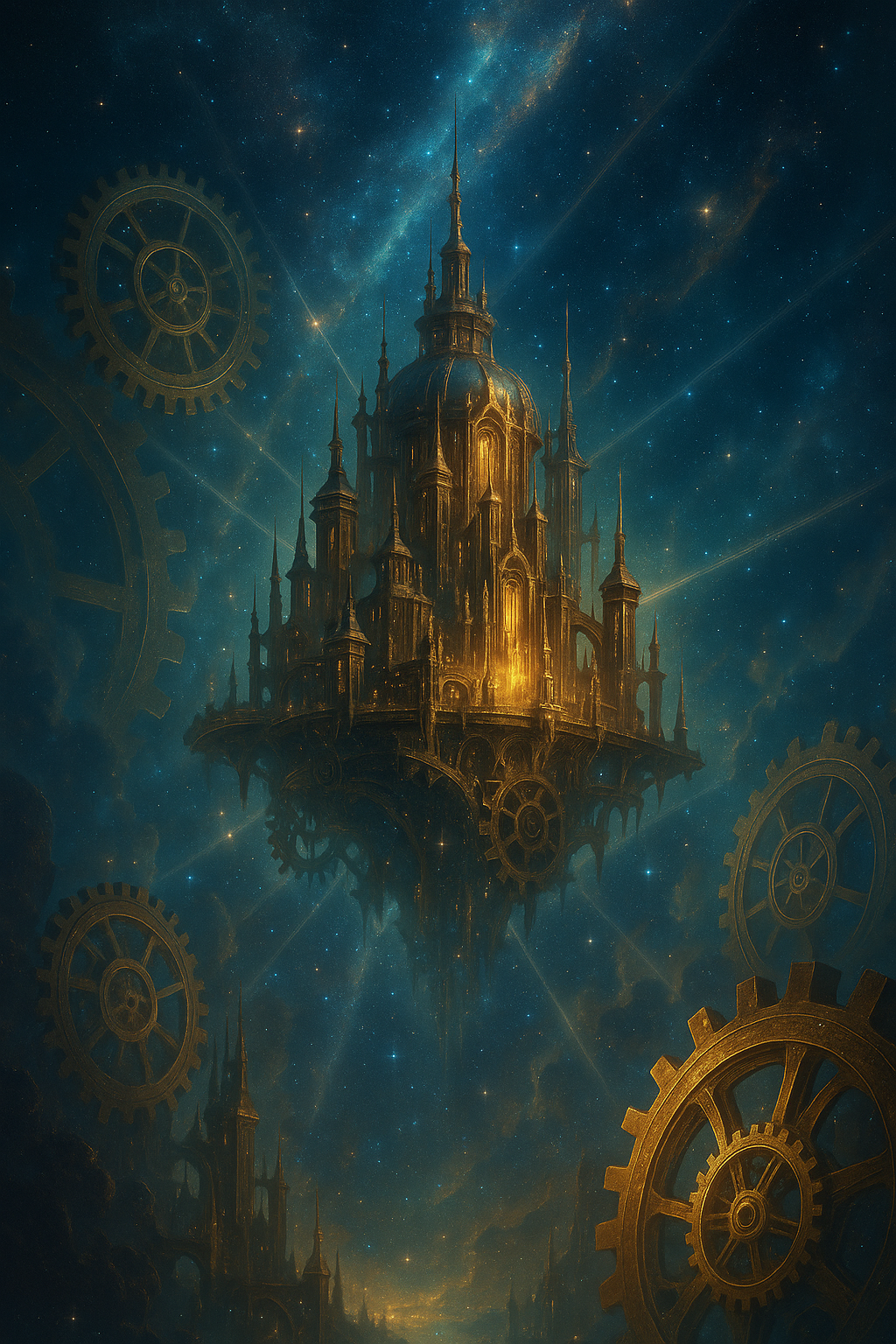 Rendered in rich hues of gold and midnight blue, this design captures the essence of cosmic elegance and steampunk ingenuity. Perfect for those who dream of fantasy worlds, interstellar exploration, and the beauty of mechanical perfection suspended in time.
