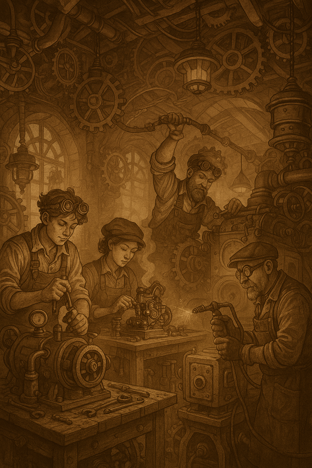 Steampunk Workshop in Action brings to life the heart of invention — a bustling mechanical atelier where sparks of genius meet the hiss of steam and the rhythm of turning gears. Within the warm glow of sepia light, four dedicated engineers and machinists work in harmony amid a labyrinth of pipes, brass fittings, and whirring mechanisms. Every figure — from the welder’s focused stance to the meticulous hands assembling clockwork components — tells a story of mastery, collaboration, and endless curiosity.
