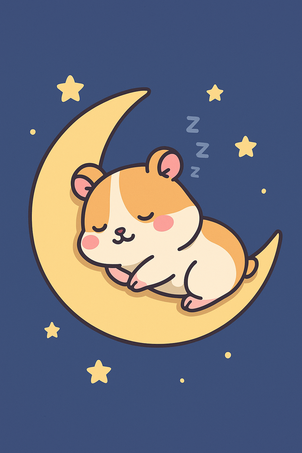 Hamster Sleeping on Crescent Moon is an irresistibly cute illustration that radiates warmth and tranquility. A tiny hamster drifts into dreamland while curled up on a soft golden crescent moon, surrounded by glowing stars and peaceful night hues.